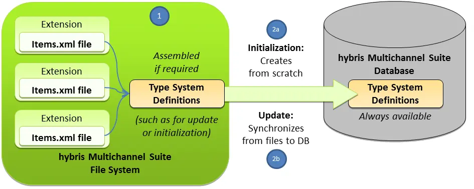 (1) There is a file-based representation that is spread across in the various items.xml files of Hybris extensions. This representation is not actively used by Hybris at runtime. You can modify this representation at any time by modifying the items.xml file of an extension. However, modifications of the items.xml files only take effect after an initialization or an update of Hybris.