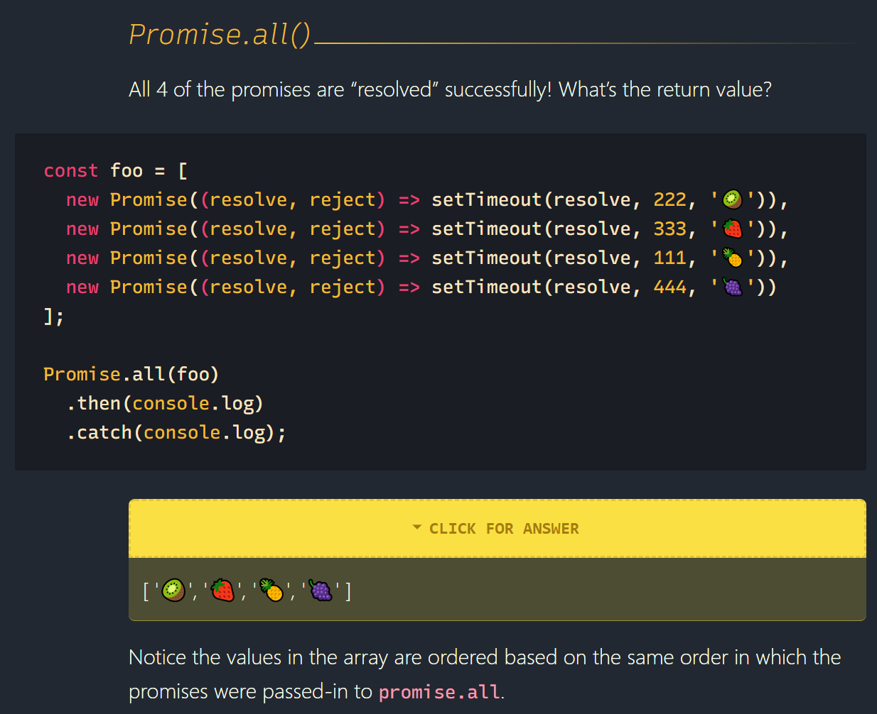Promise.all accepts an array of promises, and will attempt to fulfill all of them. Exits early if just 1 promise gets rejected.