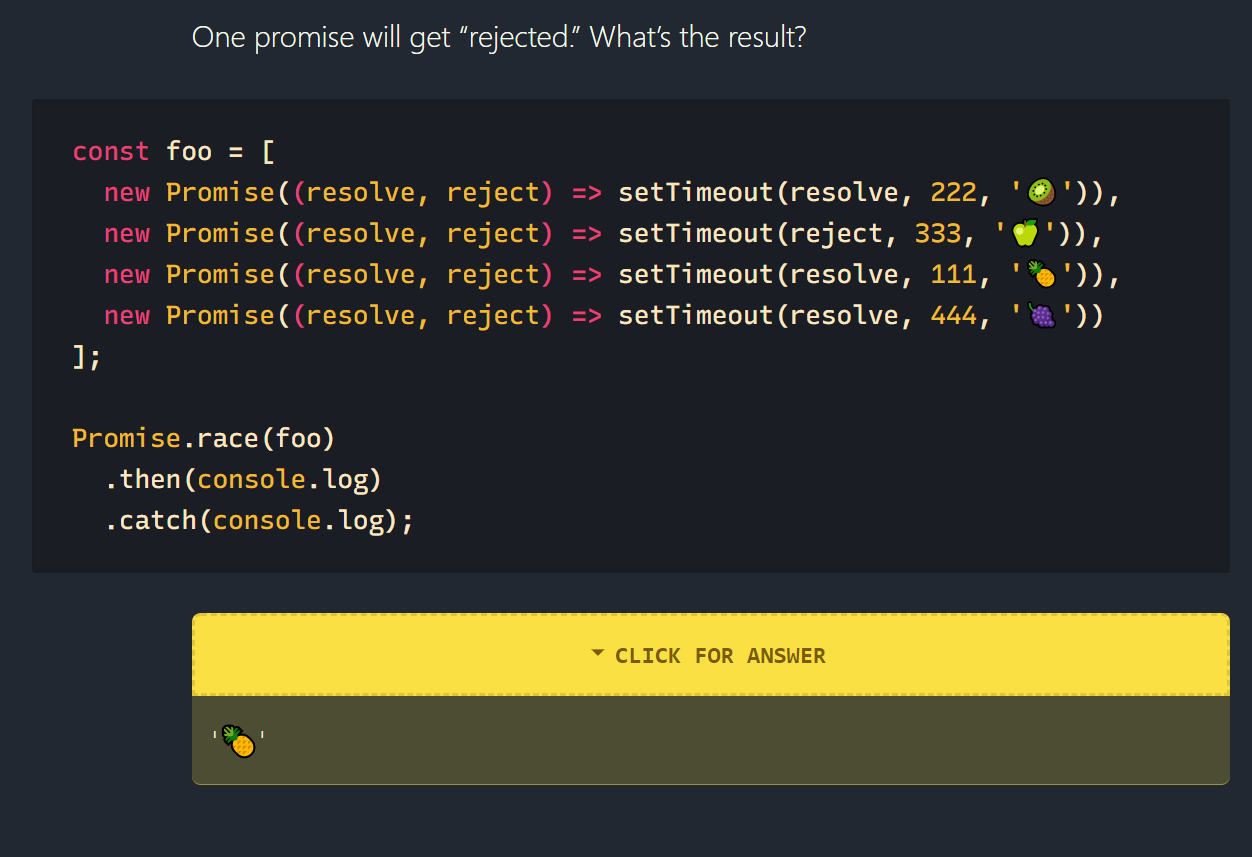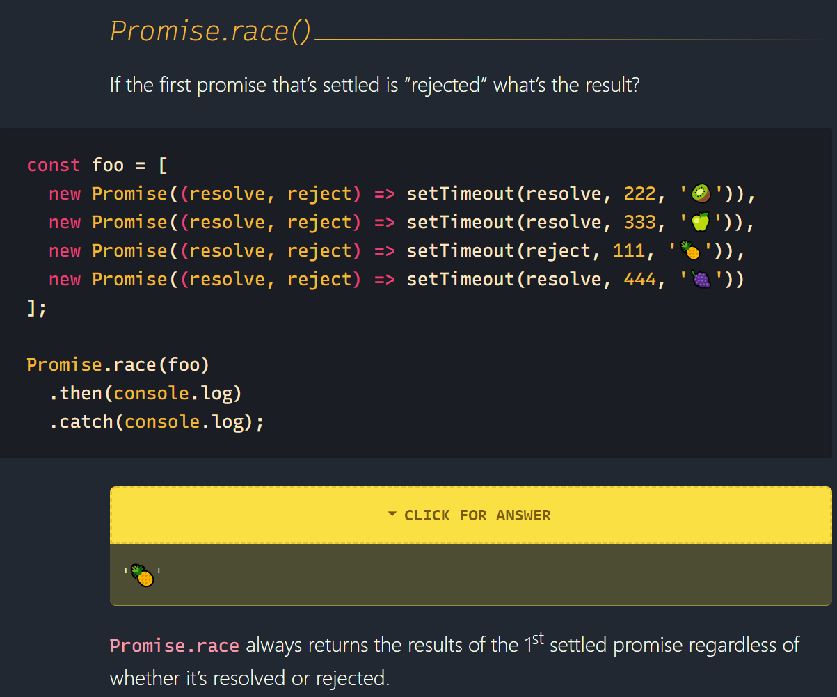 Promise.race also accepts an array of promises, but returns the first promise that is settled. A settled promise can either be resolved or rejected.