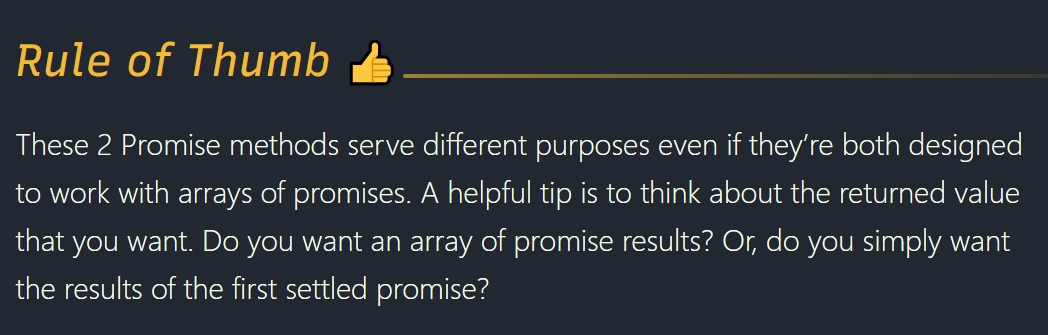 Both of the Promise methods receive an array of promises, however, you’ll want to choose one over the other depending on what you need to accomplish.