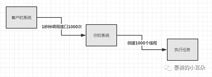 如下图,假设有这么一个场景,客户的系统每次调用你的系统接口的时候,你拿到消息直接就开一个线程去处理消息。