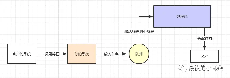 就是你的系统一开始就创建好一个线程池,里面可以设置几个线程。之后客户的系统调用你系统接口的时候,你就不要每次都new一个线程去处理了,你可以直接把消息放到一个内存队列中,放完之后,你就激活一下线程池,它就会从队列中获取任务然后让池子里的线程去处理了。这样一来,就不会有最开始我们讲的,同一时间你的系统创建大量线程导致系统性能下降甚至宕机的问题了。
