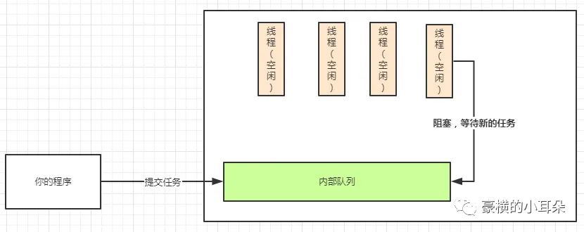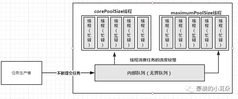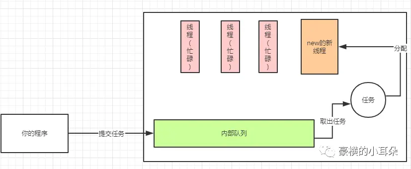 假如现在你提交了一个任务到线程池,任务会先放到内部队列中。线程池会看当前的线程数量是否大于参数corePoolSize。corePoolSize就是你new线程池的时候填的一个参数。此时,如果当前线程数小于corePoolSize,线程池就会直接new一个新的线程来处理任务。