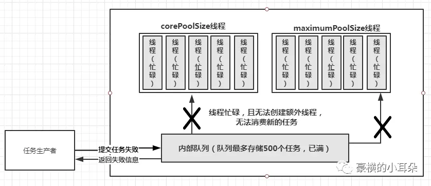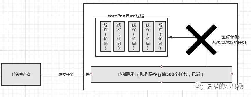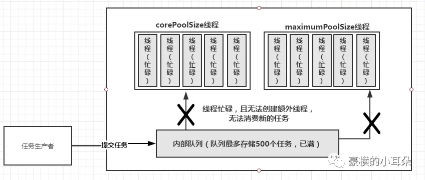 那如果你使用的是有界队列。比如说,你创建线程池的时候,有界队列设置的是最多存储500个任务。假如现在你的服务还没有处理完这些任务,corePoolSize线程都是忙碌状态,可是任务生产者又继续生产新的任务到队列中,如图