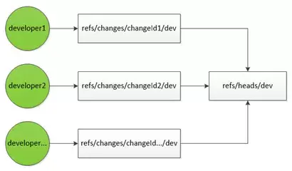 火眼在实现Code Review利用的就是将对分支refs/heads/{Branch}的提交,改为指向到refs/changes/{ChangeId}/{Branch},其中ChangeId是指的某个特性,Branch是相应的开发分支,通过这个特性来存储待评审的Commit内容,当评审通过时,将refs/changes/{ChangeId}/{Branch}合并到原先正常的分支中。以开发dev分支为例,提交的模型如下: