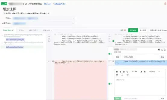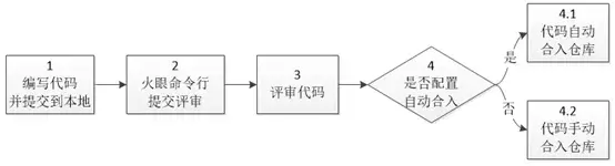 - 评审代码:在火眼平台对代码进行审查,审查通过后代码会自动合入(可配置手动合入)。