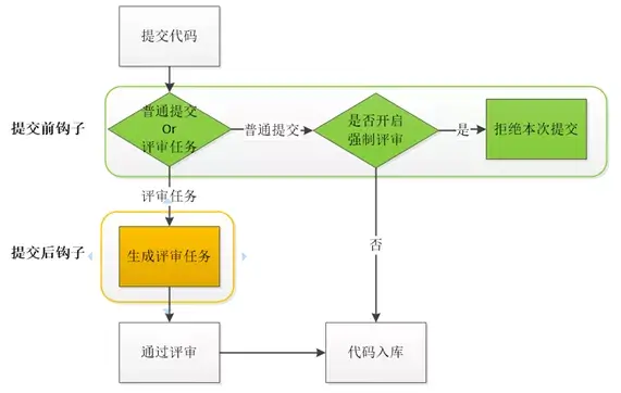 火眼Git钩子是火眼系统实现的两个Git服务端两个钩子:提交前钩子(pre-receive)和提交后钩子(post-receive)。提交前钩子用于提交代码用户选择普通提交并开启强制评审时,系统拒绝本次提交。提交后钩子用于当评审代码已成功提交,调用火眼平台,生成评审任务。下图展示了两个钩子在提交代码过程中各自的功能: