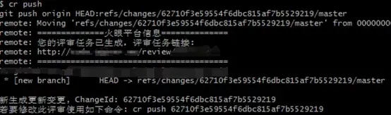 提交评审:使用火眼命令行提交代码,系统会反馈代码评审地址,并用内部通讯工具通知相关评审人。下图展示了使用火眼命令行提交评审、生成任务的过程: