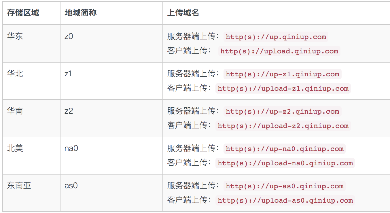AccessKey、SecretKey 都可以从你的七牛后台的个人中心页面看到,直接复制过来即可。存储空间名就是你一开始创建的存储空间,访问地址则是你自己的域名,例如 img.javaboy.org。存储区域根据自己一开始选择的华南/华东/华北等,根据实际情况填写,但是这里注意填写区域简称: