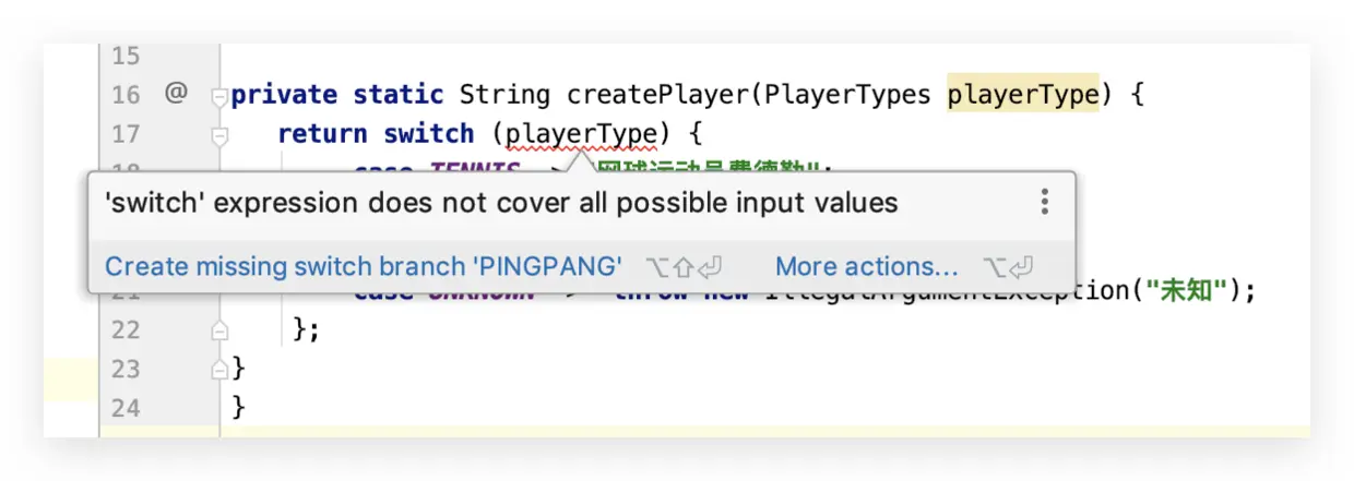 新的 switch 语句足够的智能化,除了有上述的 3 个优势,还可以对枚举类型的条件进行校验。假如在 PlayerTypes 中增加了新的类型 PINGPANG(乒乓球):