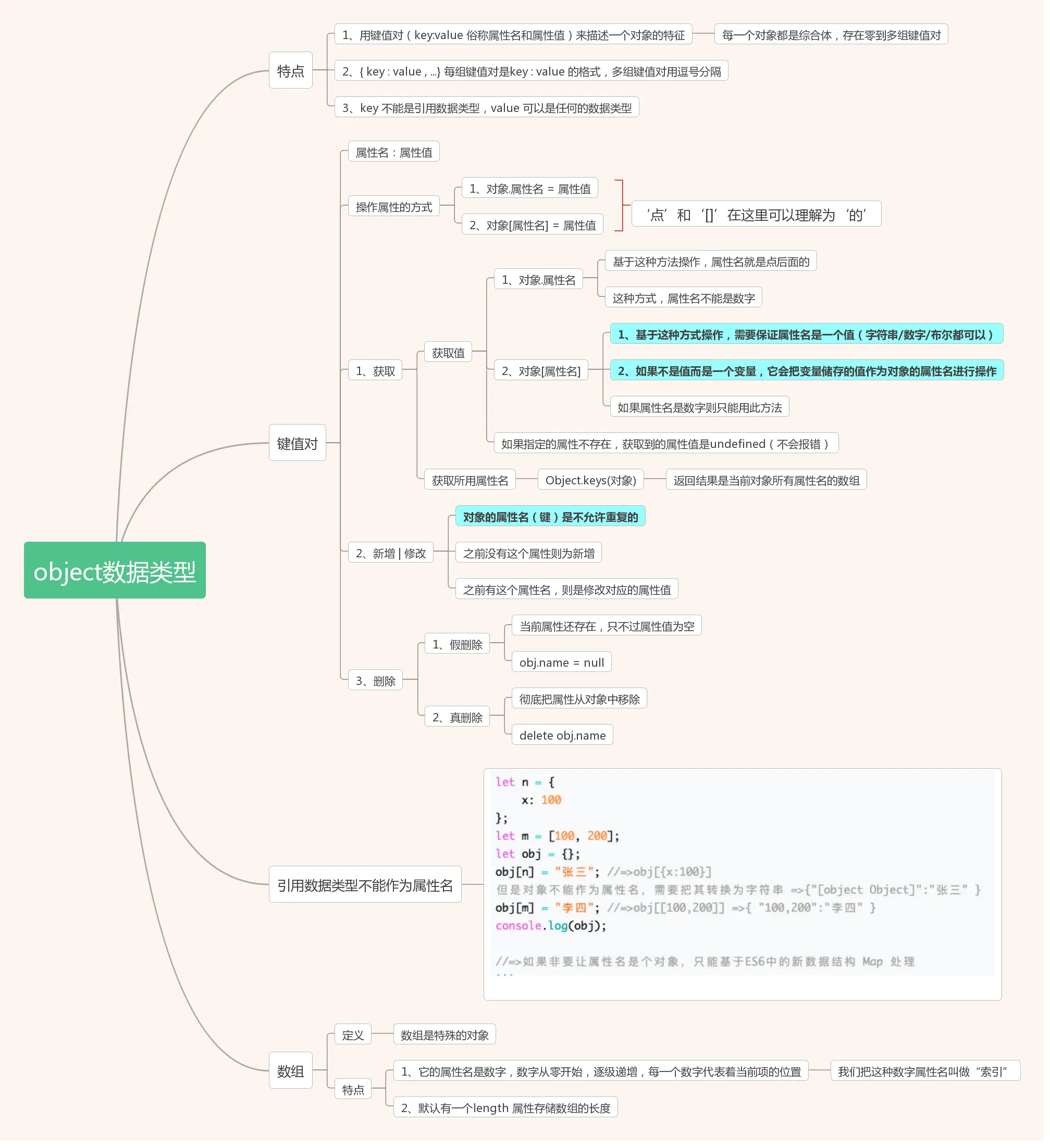 let n = 100; let obj = { 1: 100 }; console.log(obj[1]); console.log(obj.1); //=>Uncaught SyntaxError: missing ) after argument list 基于点的方式操作有自己的局限性,属性名不能是数字的,不能 对象.数字属性,此时只能用 对象[数字属性] console.log(obj[1]); console.log(obj['1']); //=>其它非字符串格式作为属性名和字符串格式没啥区别 obj.n = 200; //=> {n:200} n是属性名(数据格式是字符串) obj['n'] = 200; //=> {n:200} 和上面的情况一样 obj[n] = 200; //=> {100:200} => obj[100]=200 n本身是一个变量(n和'n'的区别:前者是一个变量,后者是一个字符串的值),它代表的是所存储的值100(是一个数字格式) obj[m] = 200; //=>Uncaught ReferenceError: m is not defined m这个变量没有被定义 obj[true] = 300; //=>{true:300} obj[undefined] = 400; //=>{undefined:400} console.log(obj); - 1、对象.属性名