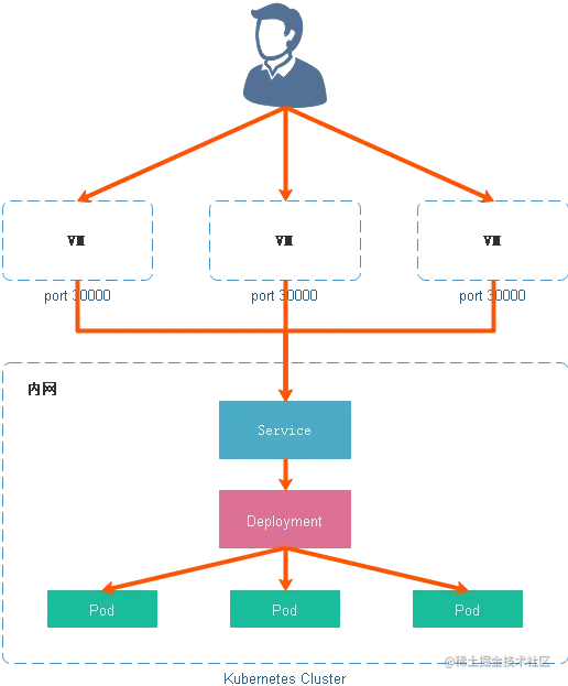 NodePort 服务是引导外部流量到你的服务的最原始方式。NodePort,正如这个名字所示,在所有节点(虚拟机)上开放一个特定端口,任何发送到该端口的流量都被转发到对应服务。