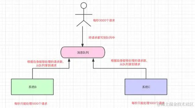 系统B和系统C根据自己的能够处理的请求数去消息队列中拿数据,这样即便有每秒有8000个请求,那只是把请求放在消息队列中,去拿消息队列的消息由系统自己去控制,这样就不会把整个系统给搞崩。
