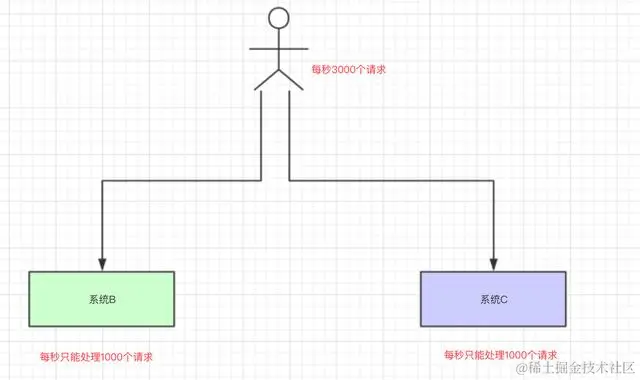 我们再来一个场景,现在我们每个月要搞一次大促,大促期间的并发可能会很高的,比如每秒3000个请求。假设我们现在有两台机器处理请求,并且每台机器只能每次处理1000个请求