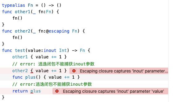 - 以下的闭包fn内部如果用到了实例成员(属性、方法),编译器会强制要求明确写出self