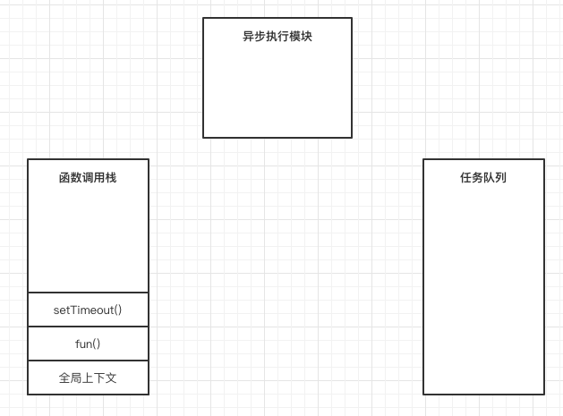 第二步,因为fun()函数内执行了setTimeout(),所以setTimeout()入栈,如图: