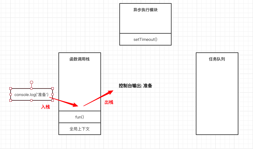第四步,fun()函数内的console.log('准备')函数进入函数调用栈并执行,所以控制台输出准备