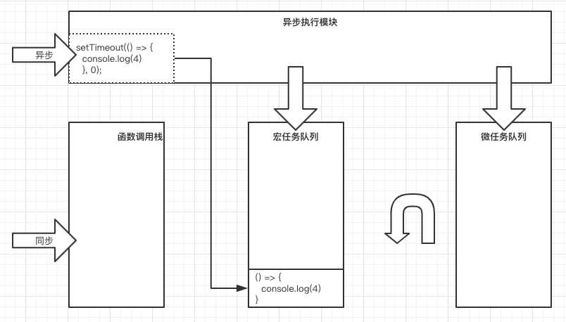 开始,程序往下走,遇到setTimeout,是异步任务,放到异步模块执行,执行结束的回调进入宏任务队列先暂存着,如图: