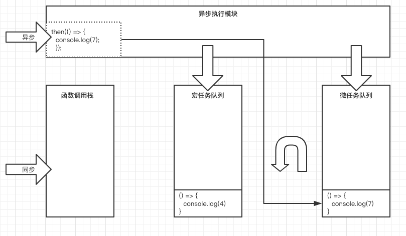 接下来,又将碰到一个Promise,Promise内构造函数的回调参数函数会立即执行,内部执行到resolve()则会调用其then(),由于then()是异步方法,所以进入异步执行模块执行之后将console.log(7)放入微任务队列,如图: