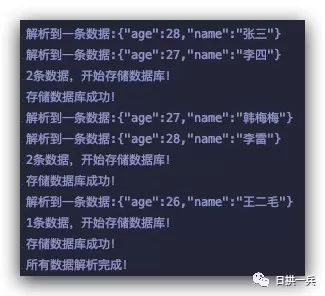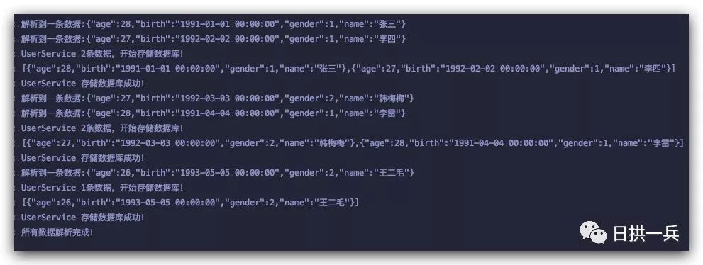 @Slf4jpublic class UserExcelListener extends AnalysisEventListener<User> { /** * 批处理阈值 */ private static final int BATCH_COUNT = 2; List<User> list = new ArrayList<User>(BATCH_COUNT); @Override public void invoke(User user, AnalysisContext analysisContext) { log.info("解析到一条数据:{}", JSON.toJSONString(user)); list.add(user); if (list.size() >= BATCH_COUNT) { saveData(); list.clear(); } } @Override public void doAfterAllAnalysed(AnalysisContext analysisContext) { saveData(); log.info("所有数据解析完成!"); } private void saveData(){ log.info("{}条数据,开始存储数据库!", list.size()); log.info("存储数据库成功!"); }}打印结果: