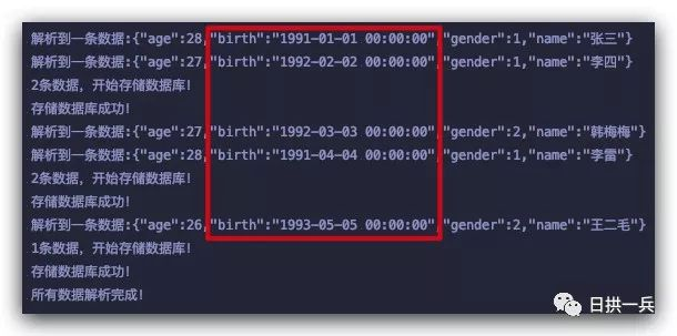 /** * 出生日期 */@ExcelProperty(index = 3)@DateTimeFormat("yyyy-MM-dd HH:mm:ss")private String birth;来看运行结果: