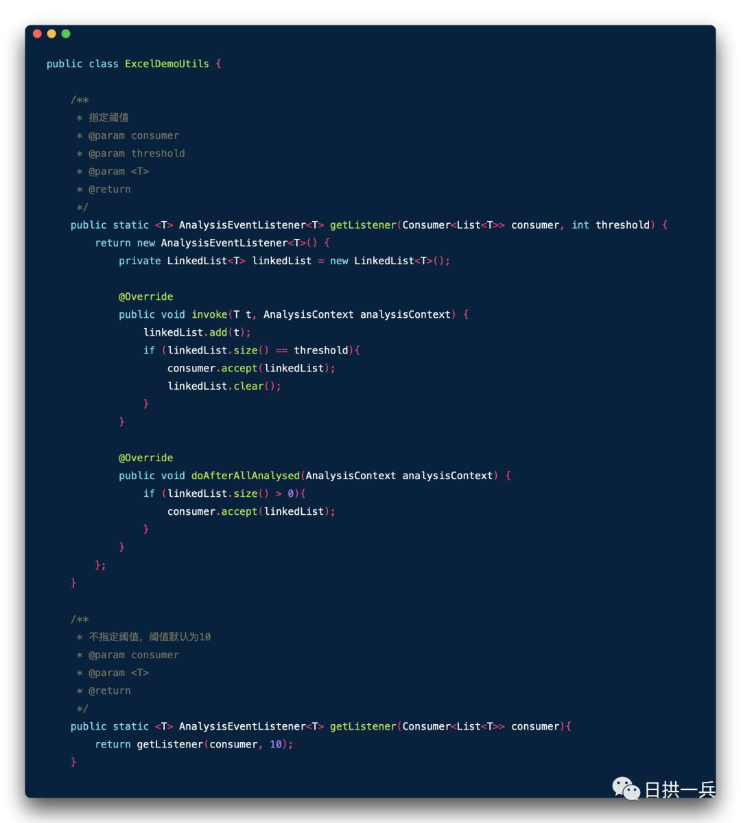 从这里可以看出,虽然是逐行解析数据,但我们可以自定义阈值,完成数据的批处理操作,可见 EasyExcel 操作的灵活性