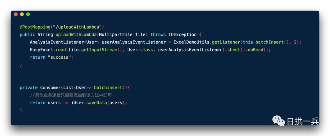 @RestController@RequestMapping("/users")@Slf4jpublic class UserController { @PostMapping("/upload") public String upload(MultipartFile file) throws IOException { EasyExcel.read(file.getInputStream(), User.class, new UserExcelListener()).sheet().doRead(); return "success"; }}其实在写测试用例的时候你也许已经发现,listener 是以 new 的形式作为参数传入到 EasyExcel.read 方法中的,这是不符合 Spring IoC 的规则的,我们通常读取 Excel 数据之后都要针对读取的数据编写一些业务逻辑的,而业务逻辑通常又会写在 Service 层中,我们如何在 listener 中调用到我们的 service 代码呢?