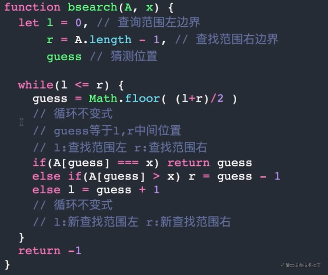 二分法的核心:循环不变式:while左边界小于右边界 ,A[guess]在右边界,则缩小右边界范围 r=guess-1,反之则缩小左边界guess+1