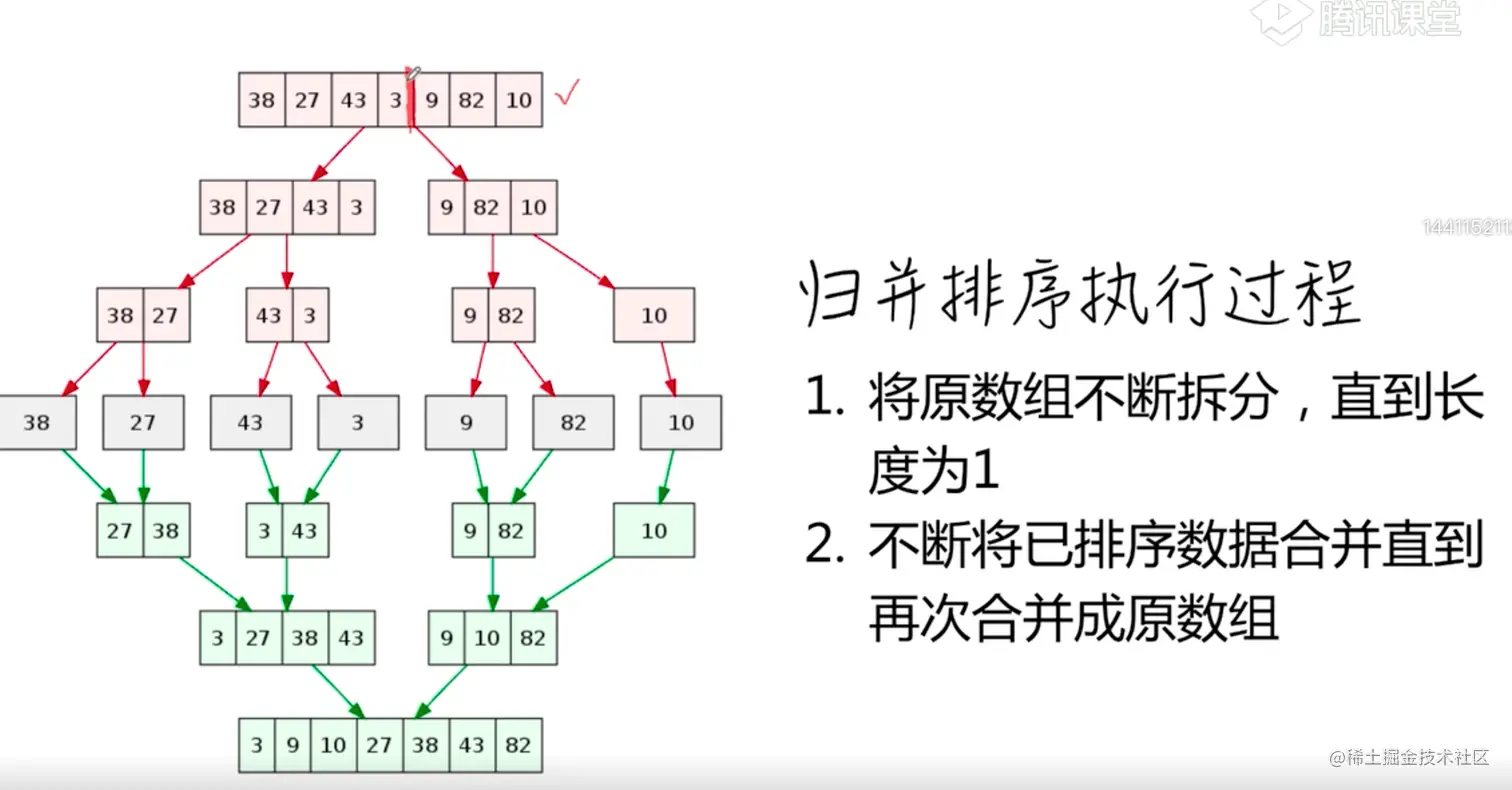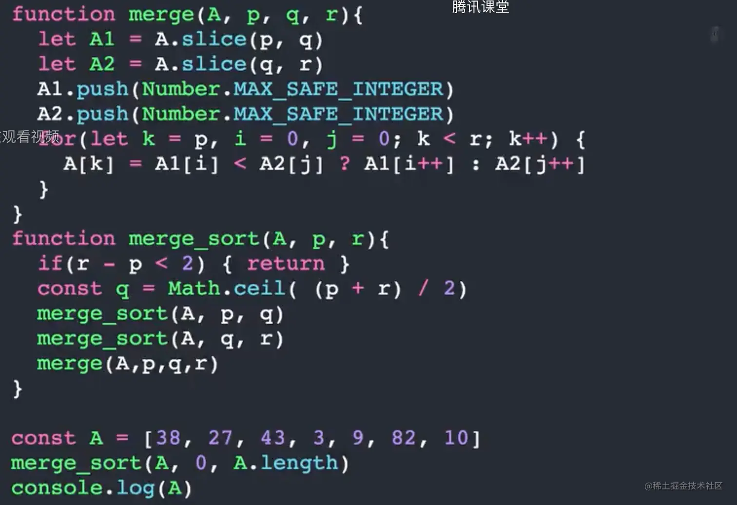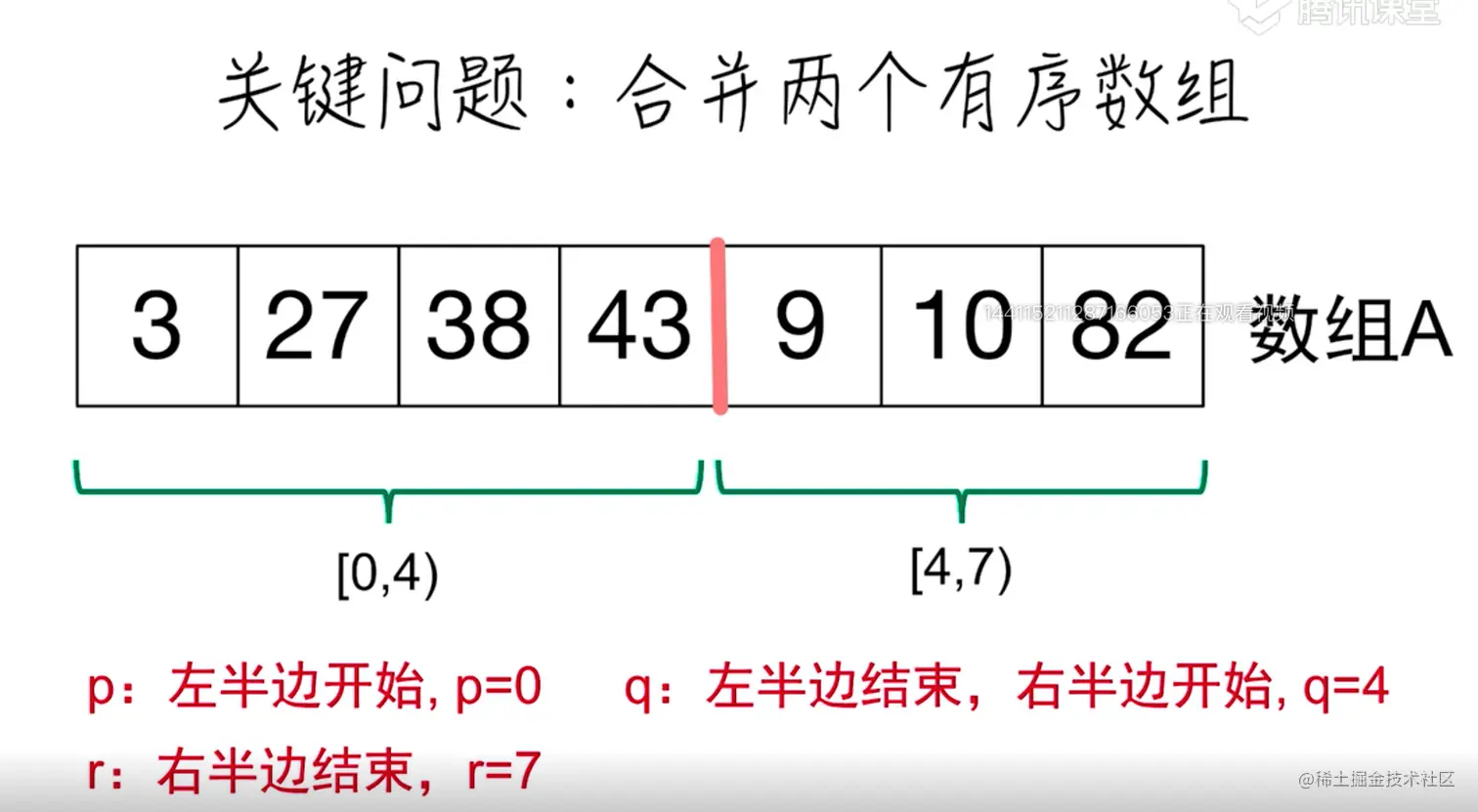 merge_sort中,核心就是if(r-p < 2) return 当原数组不断拆分,直到长度为1,接下来的q就是右半边开始