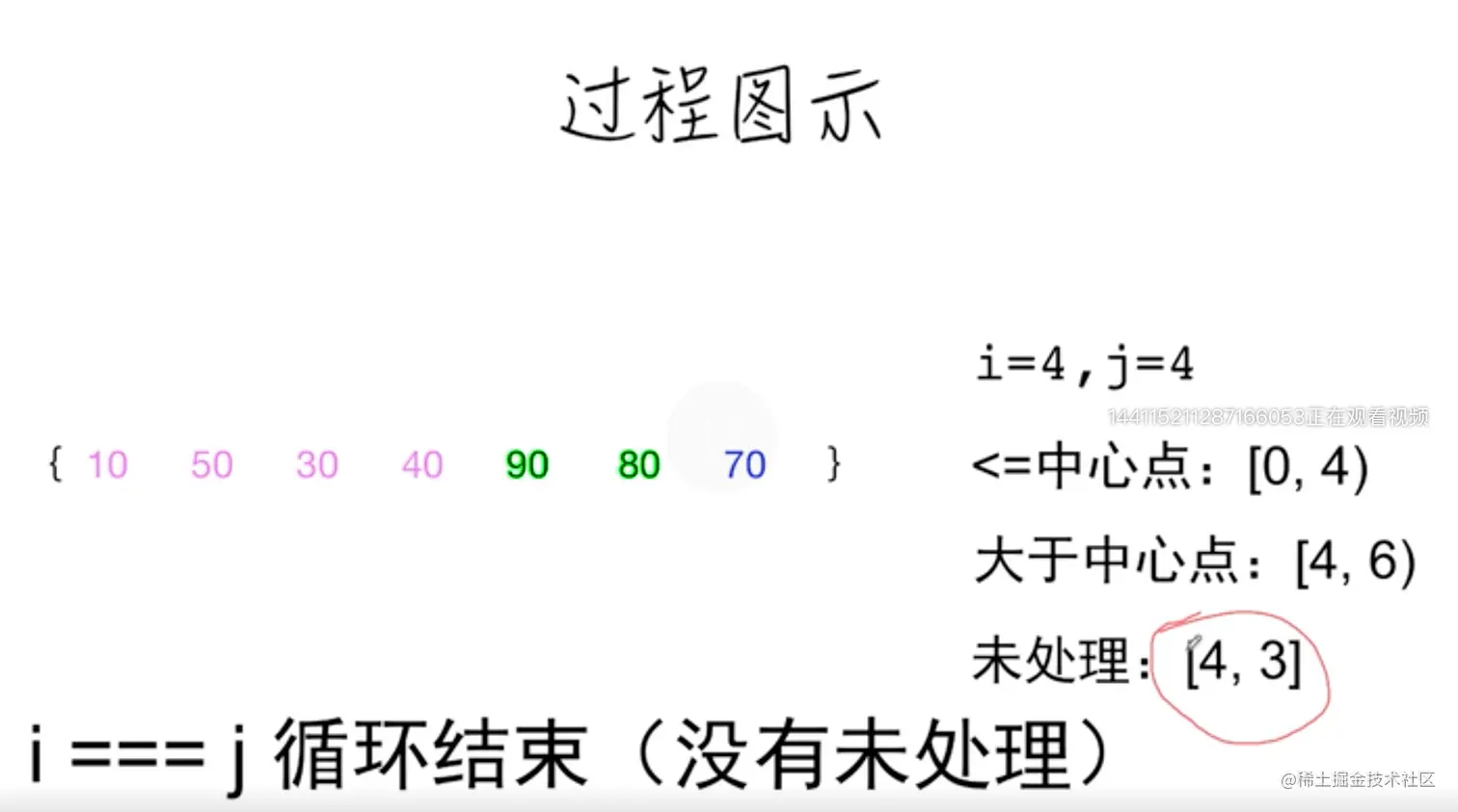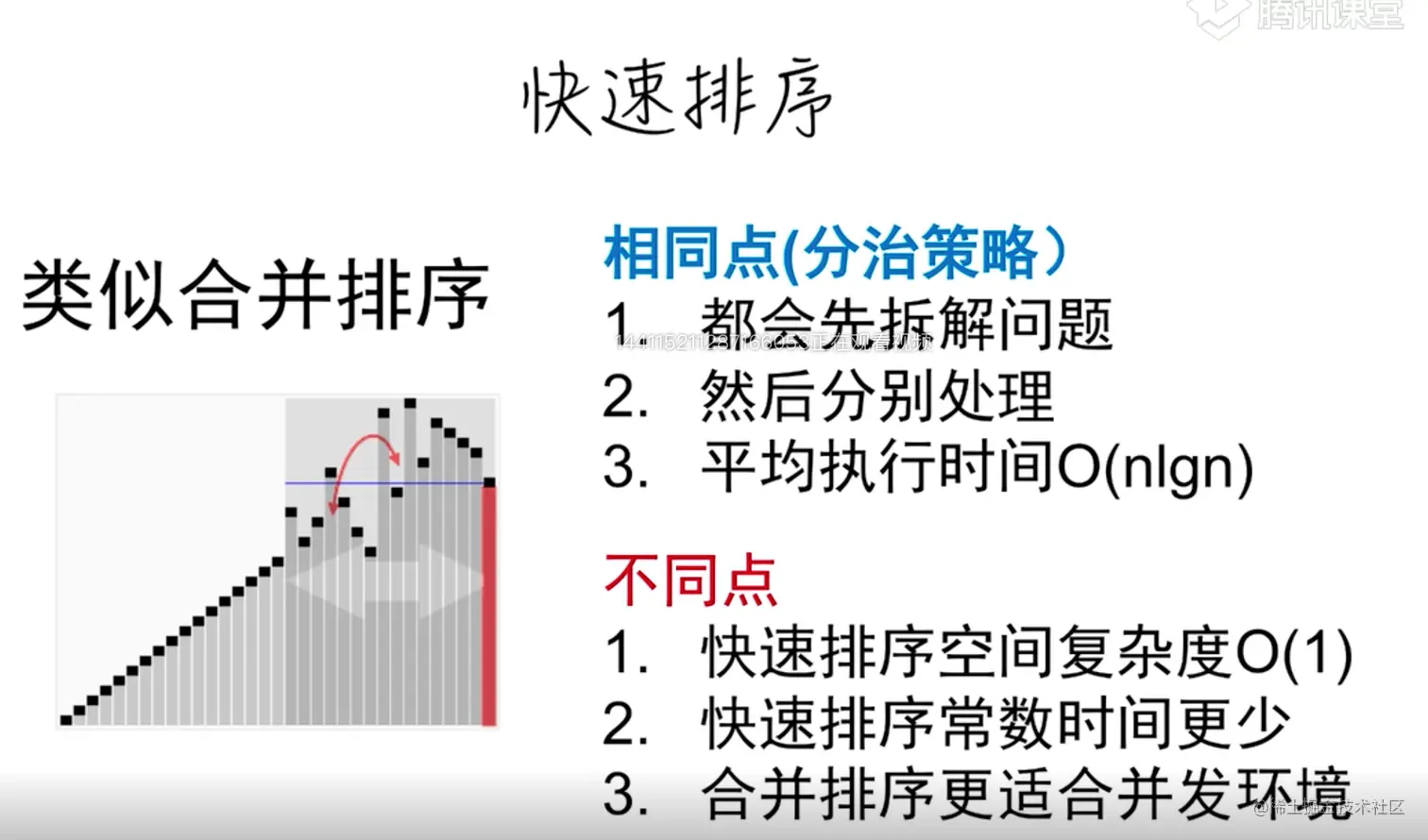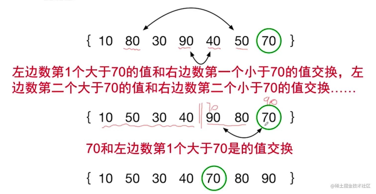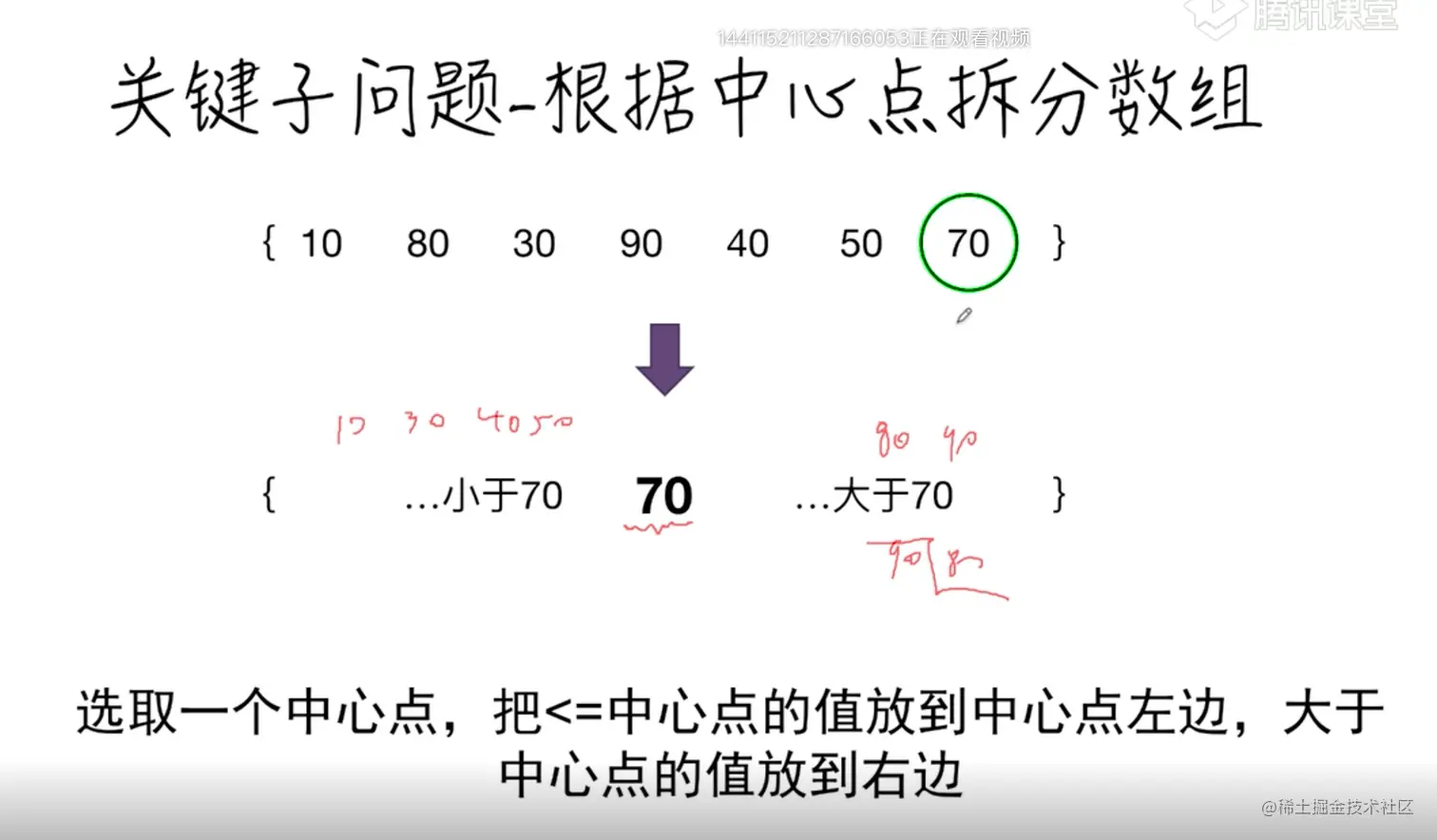 - 核心是找中心点,通过和最后一个值比较,如果大于,则和倒数第二个值交换,一直循环,最后把中心点换到中间,拿到中间点后就拆分数组,类似归并排序,不同点是,拆分的过程已经是排序了