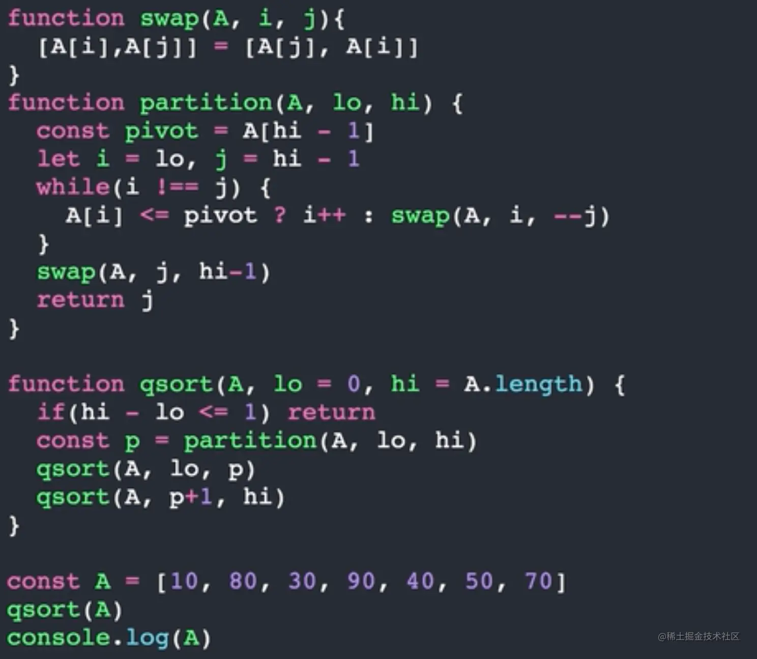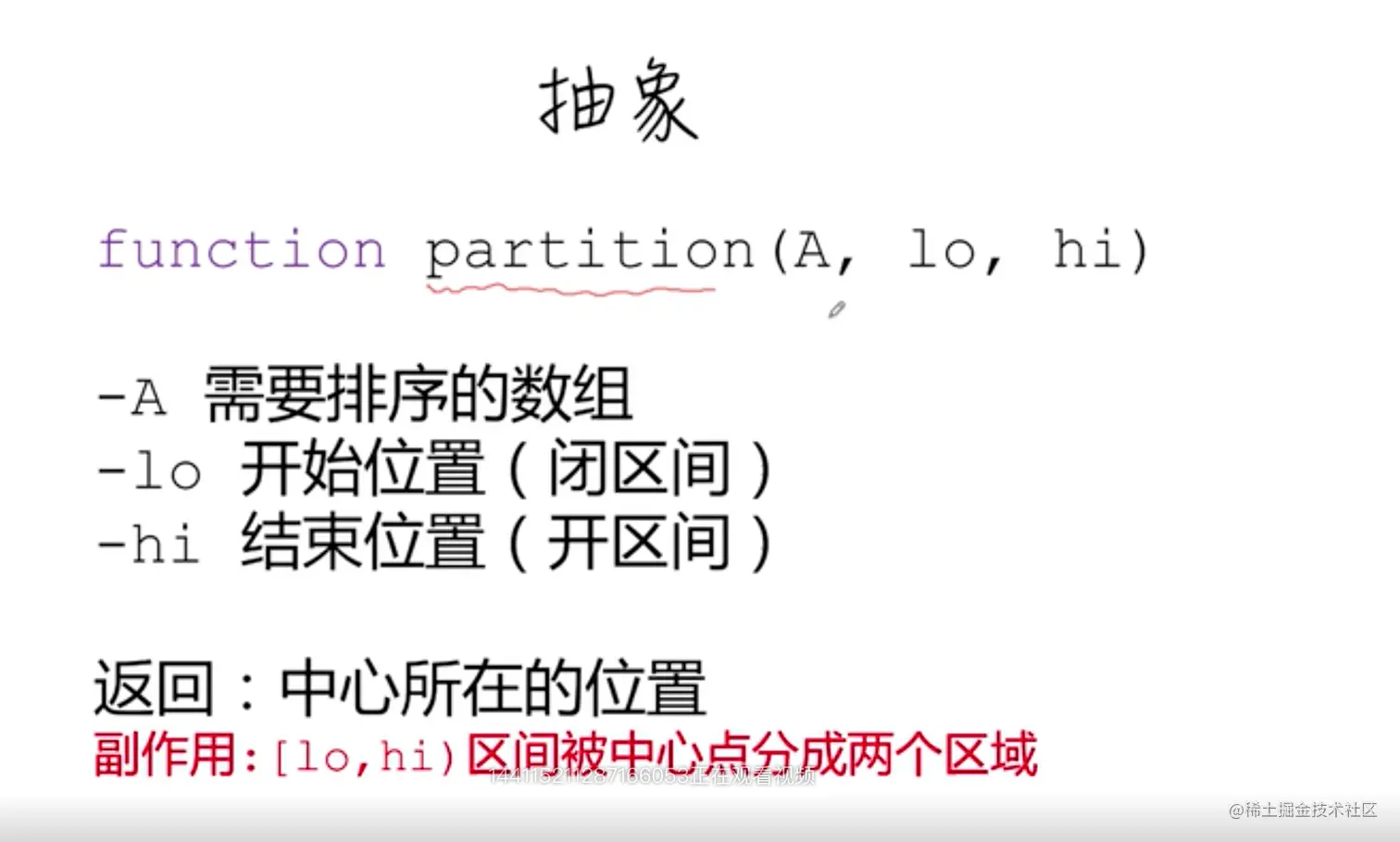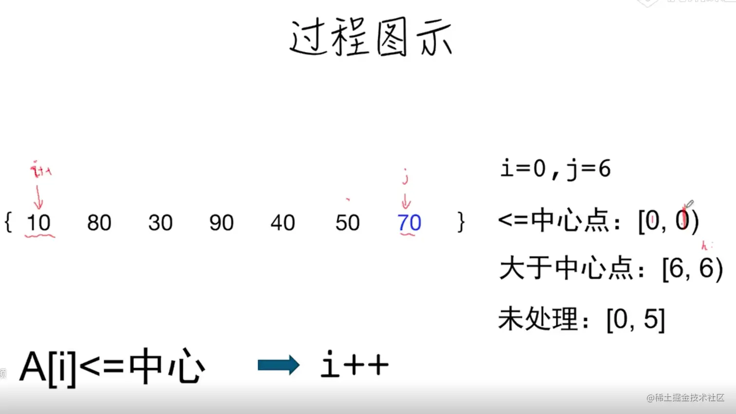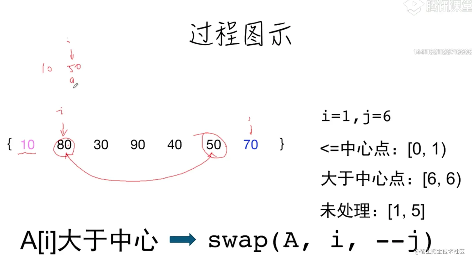 swap(A,j,hi-1)全部执行完后把中心点交换,换到中间,return j(中心点)
