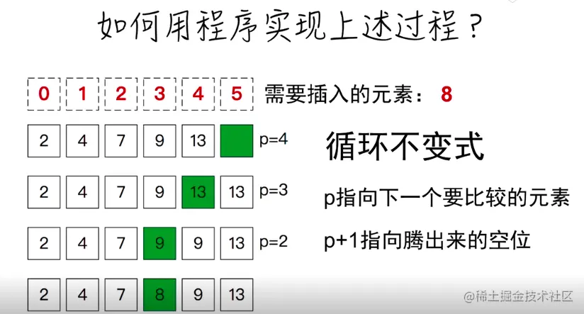 A[p+1] = x //当插入元素大于比较元素,则插入到比较元素后一个