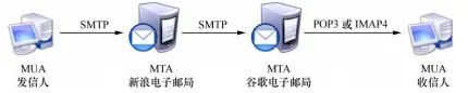 举个例子,假设你用一个新浪信箱给一个谷歌信箱发送一封电子邮件,其传输过程如下图: