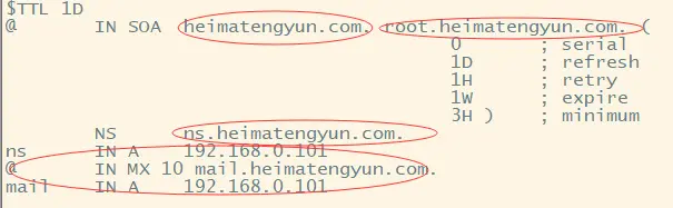 [root@mail ~]# vim /var/named/heimatengyun.com.zone