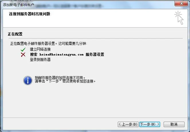 之前我们配置Dovecot为使用明文登录电子邮件服务,而Outlook软件默认会通过SSL加密协议尝试登录,因此会提示加密连接不可用。