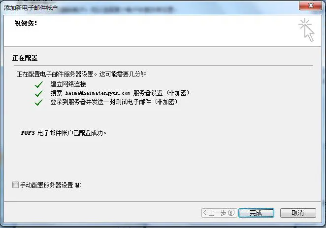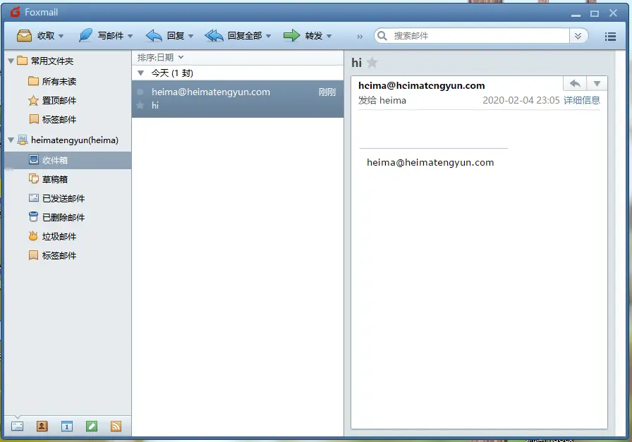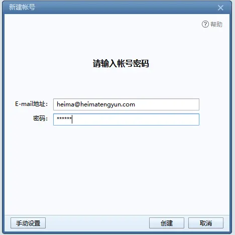 姓名任意取,电子邮件为前边创建的系统用户heima加上发件域,即为:heima@heimatengyun.com,密码为heima账户的登录密码。