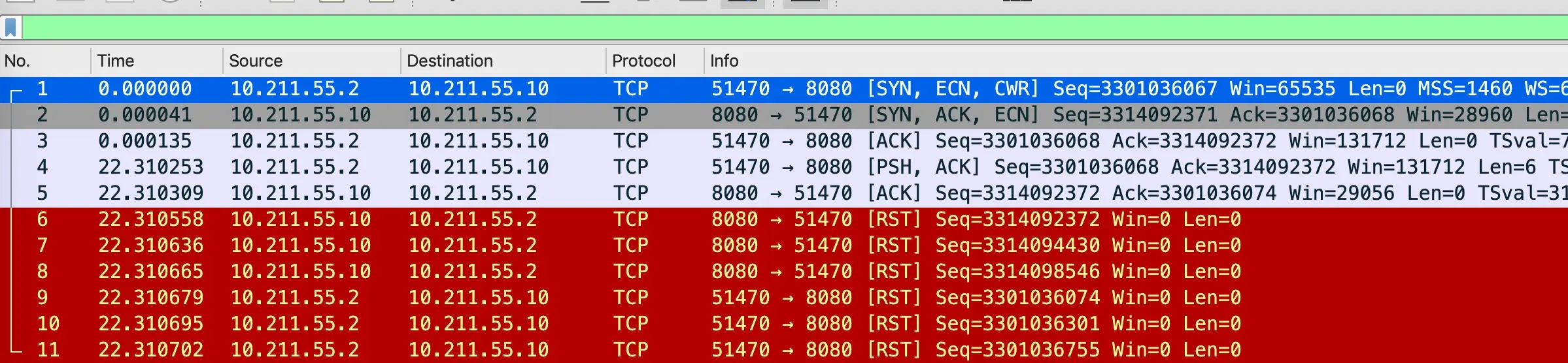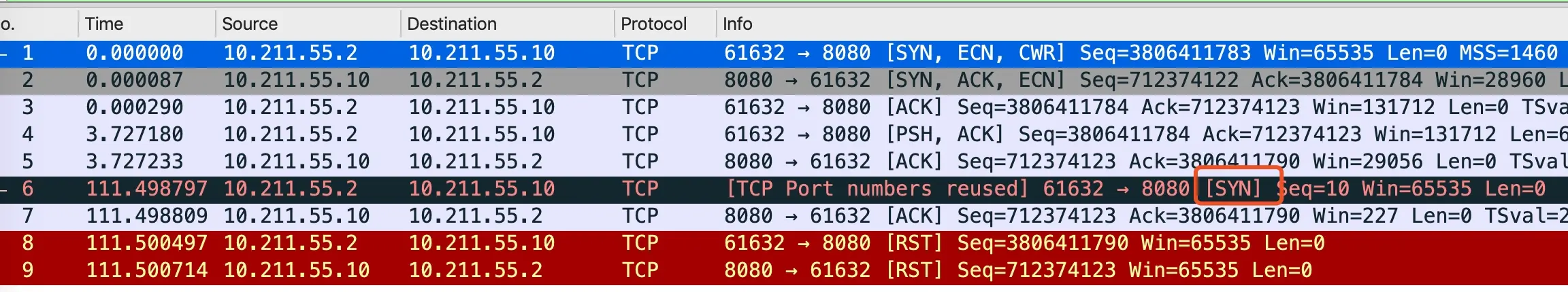 03:40:30.974889 IP 10.211.55.20.50718 > 10.211.55.10.9090: Flags [S], seq 10, win 8192, length 0