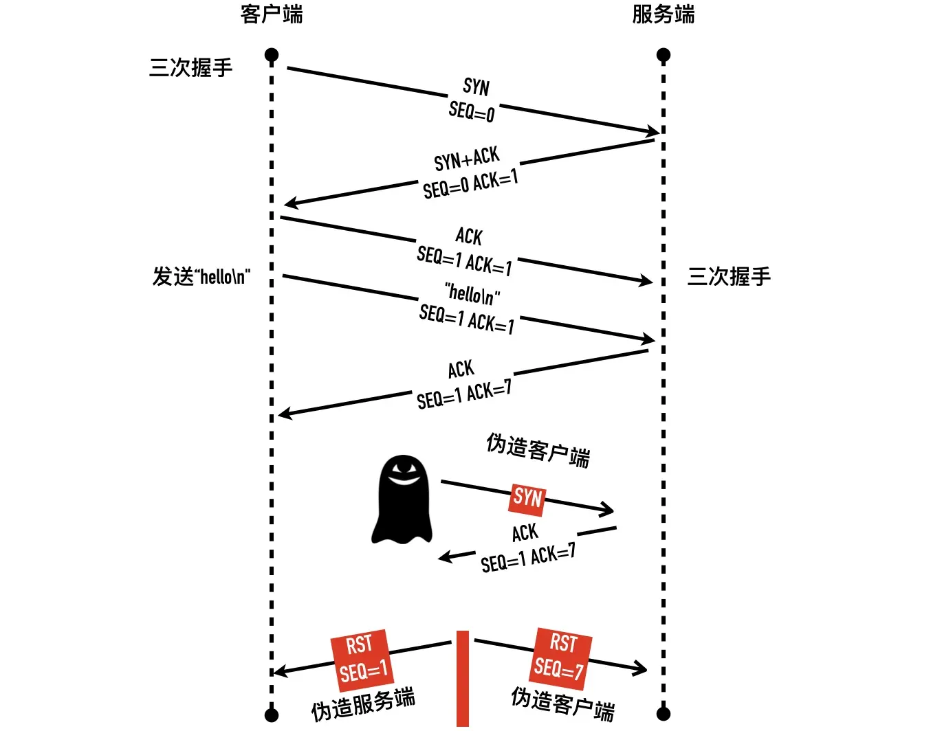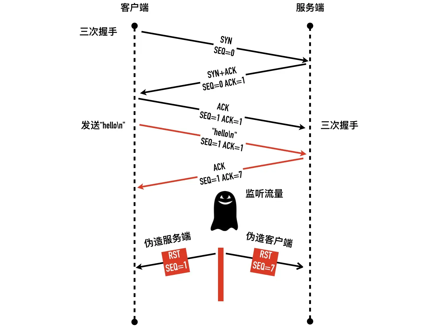 RST 攻击也称为伪造 TCP 重置报文攻击,通过伪造 RST 报文来关闭掉一个正常的连接。