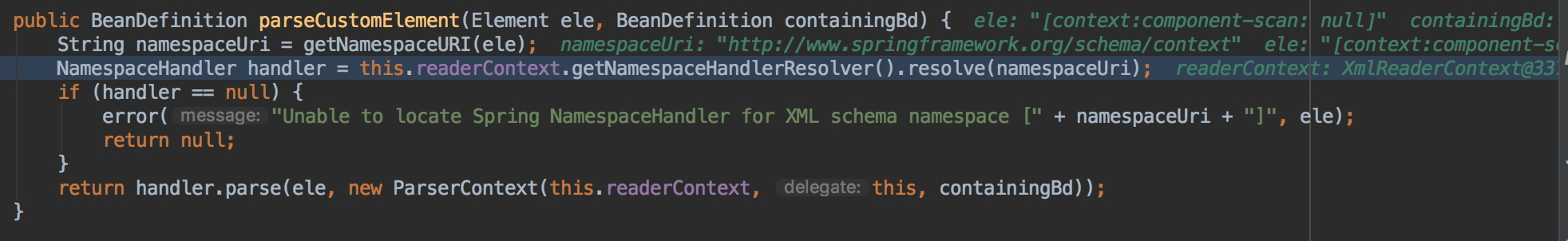 - 根据namespaceUri获取NameSpaceHandler,即ContextNamespaceHandler,其实Spring自己在META-INF/spring.handlers中维护了namespaceUri,在解析Element时,已经load到内存里放到handlerMappings里了。