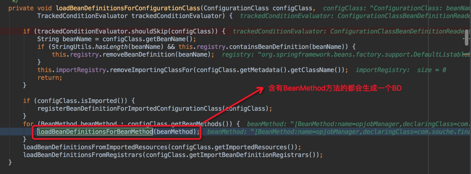 由上图可以发现有BeanMethod生成的BD,会有一个factoryBeanName,根据factoryBeanName去排除。