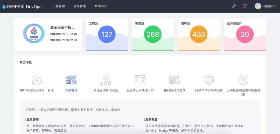 DEEPEXI DevOps:定位于企业级智能DevOps平台,通过 DDP(开发平台)、DTP(测试平台)、CI/CD(构建发布)、 DAG(应用网关) 、DAE(应用引擎)5大子产品来支撑和规范企业应用的开发、测试、架构、交付、运维和运营的全流程,满足支撑业务高速发展所需的敏捷开发、高效运维和精益管理的需求。