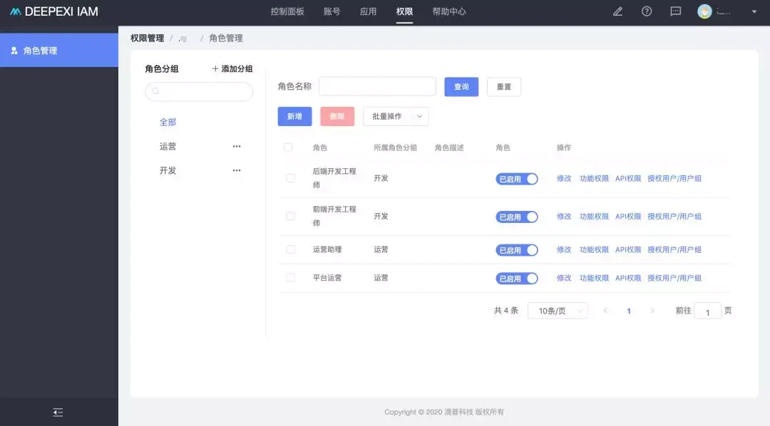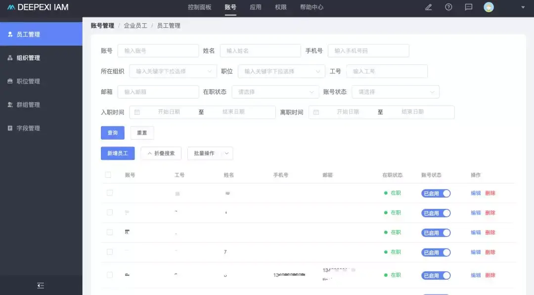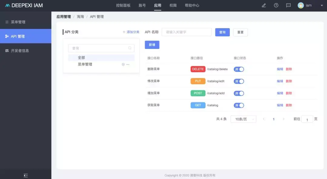- DEEPEXI IAM(DEEPEXI Identity and Access Management): 企业级的账号和权限管控平台,可以管理用户(比如员工、系统或应用程序)账号,并且可以控制这些用户对企业资源的操作权限、数据权限。