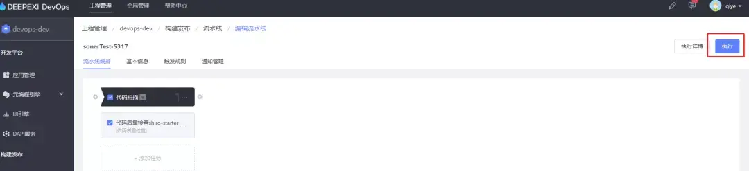 5. 测试人员在DEEPEXI DevOps 上关联流水线统筹Test环境的应用构建和发布。