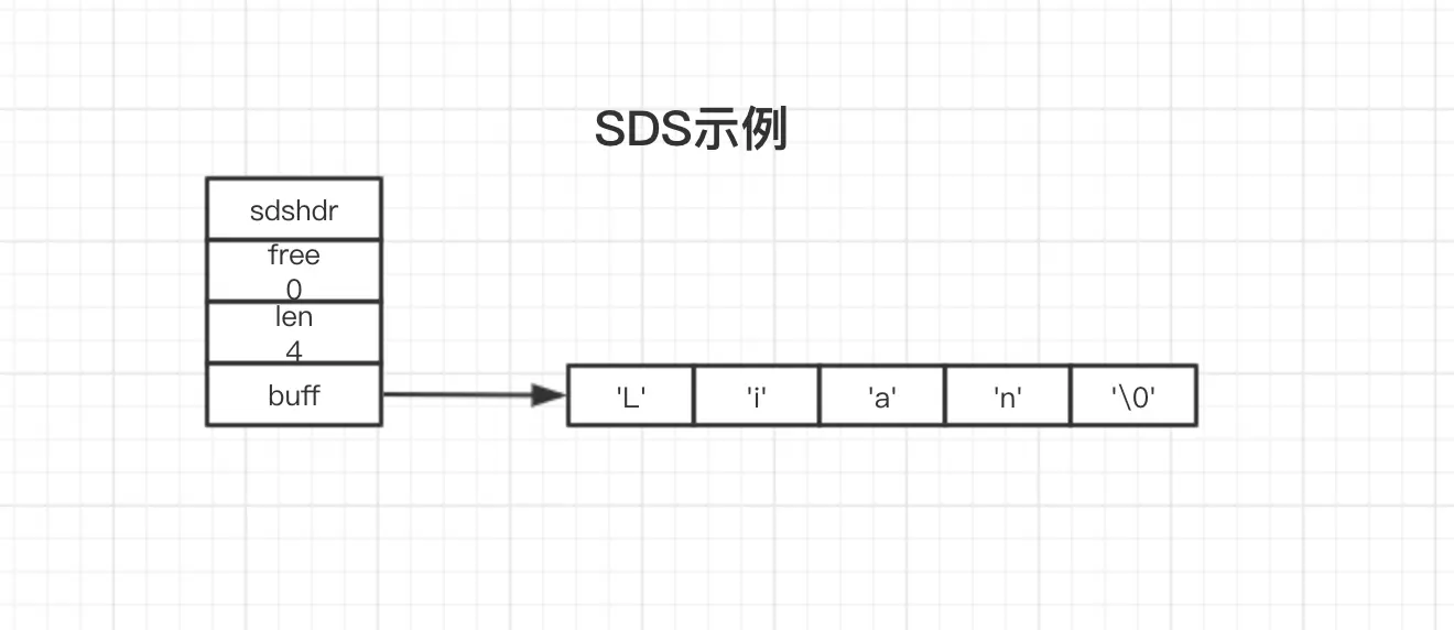 free值为0, 表示这个SDS没有分配任何未使用空间。 len值为4, 表示这个SDS保存一个四字节长的字符串。 buff值为一个char类型数组,分别保存’L‘,’i','a','n' 4个字符,最后一个字节保存;’\0‘