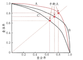 -- P-R图:以查全率做x轴,查准率做y轴的平面图。判断模型优劣的两种方式:1、平衡点(查全率=查准率时的取值)更大的性能更好;2、曲线没有交叉的情况下,被“包住”的曲线模型性能弱于外侧的模型,如下图,A模型优于C模型。