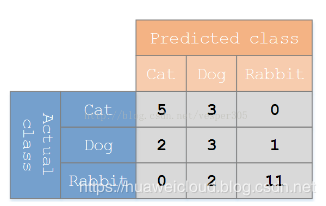 -- 混淆矩阵:用在分类问题中的NxN矩阵,N为分类的个数。如下图猫、狗、兔子的三分类系统,每一列代表预测值,每一行代表实际值,对角线两边的都是预测错误的,从混淆矩阵中可以很直观地发现问题在哪里。