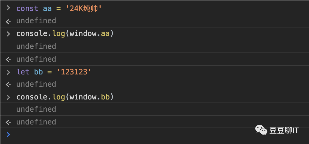 两个大括号之间的就称之为一个块,块级作用域也就指的是在当前大括号内声明的变量只在当前大括号中有用,出了大括号就访问不到了,我们来看一下使用 const/let 声明的变量能不能用顶层对象访问到: