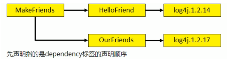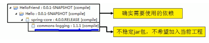 好处:可以传递的依赖不必在每个模块工程中都重复声明,在“最下面”的工程中依赖一次即可