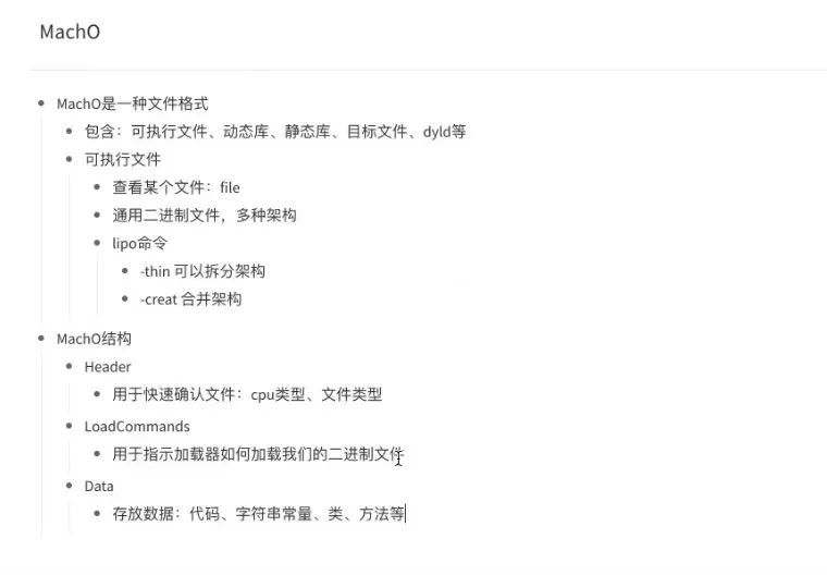 Mach-O其实是Mach object文件格式的缩写,是mac 以及iOS上可执行文件的格式,类似于windows上的PE(portable executable)格式linux上的elf(executable and linking format)格式; Mach-O是一种用于可执行文件、目标代码、动态库的文件格式。