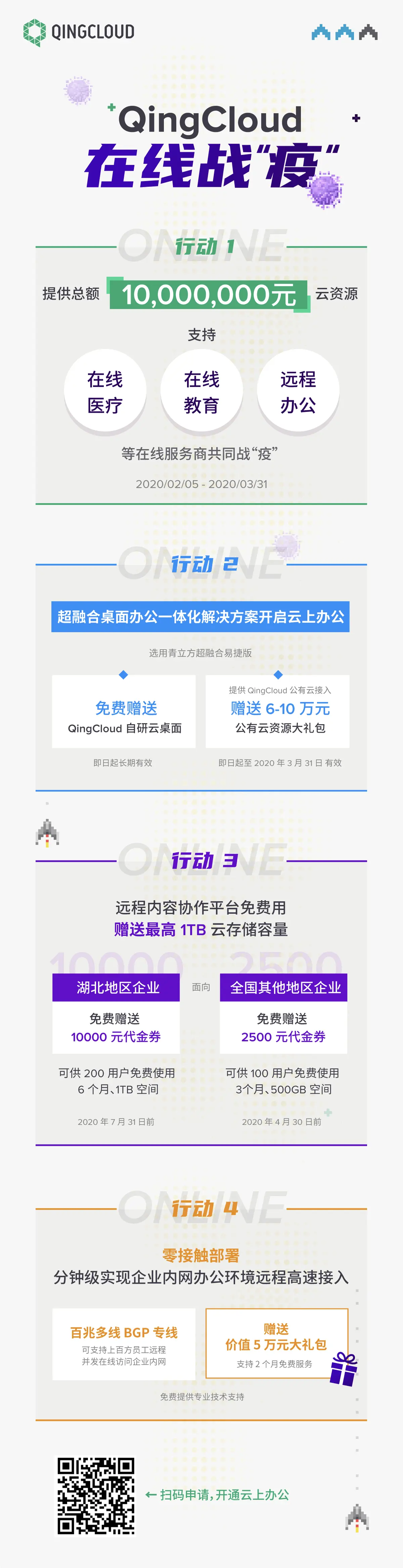 QingCloud 启动五大行动,为大家提供总额 1 千万元云资源,详情可查看下方抗“疫”专区内容,欢迎大家关注使用👇